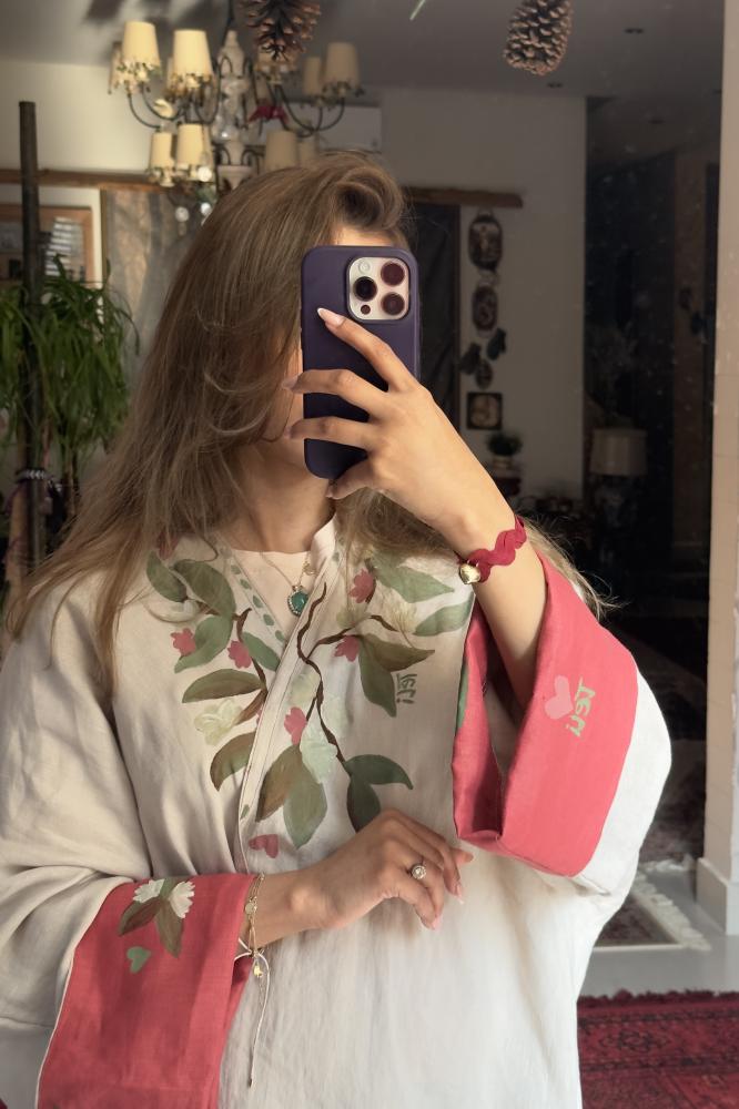 اكتشفي "كرمزي"، عباية استثنائية مصنوعة من أجود أنواع اللينين الإيطالي، بتصميم يفيض بالرقي والبساطة. تميزها التفاصيل المرسومة يدويًا بعناية فائقة، مما يجعل كل قطعة أشبه بلوحة فنية لا تُكرر.